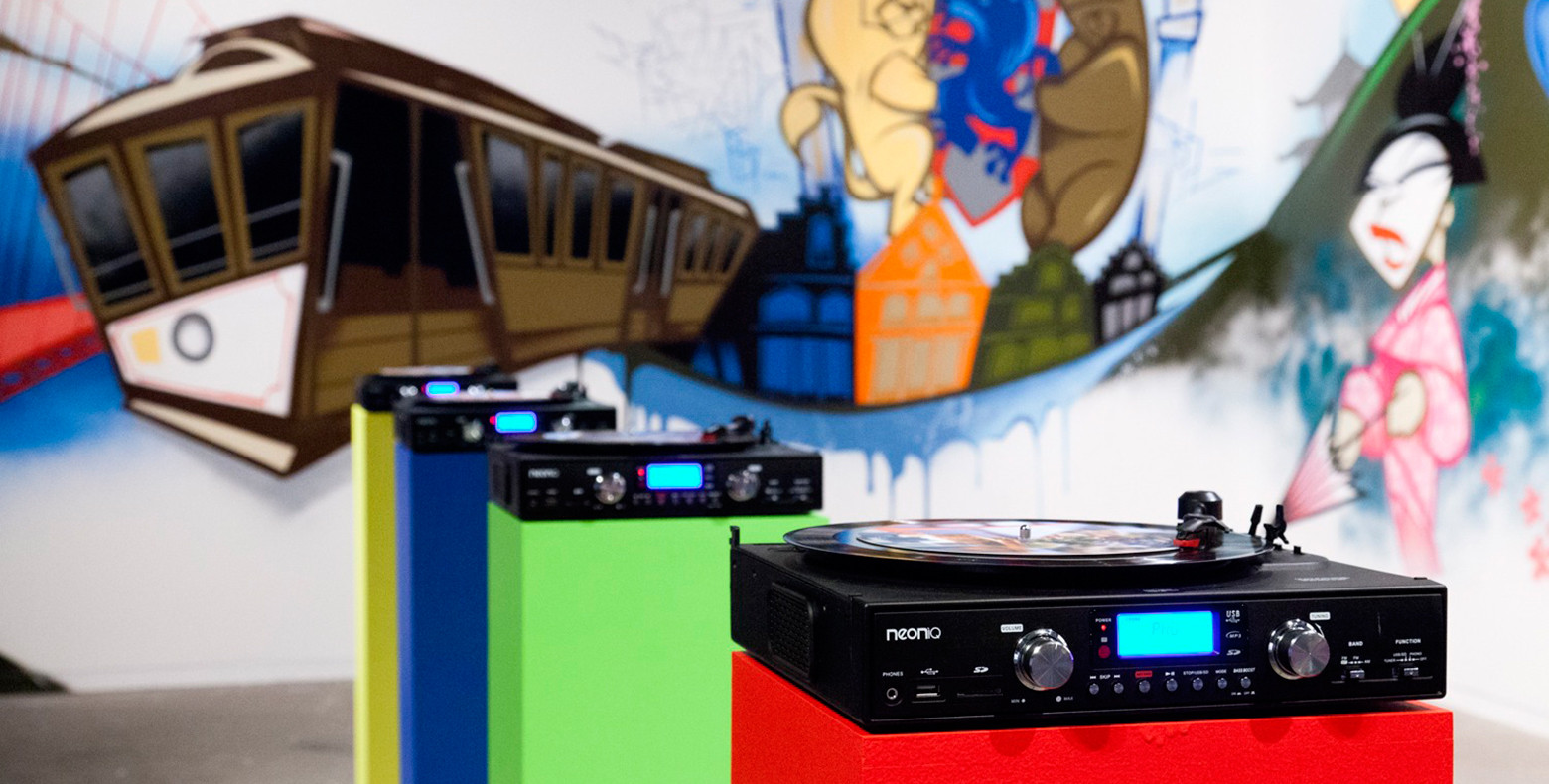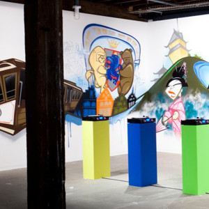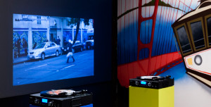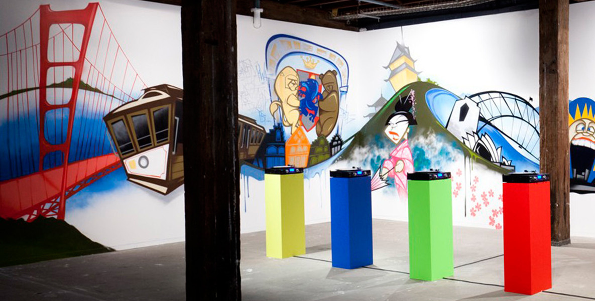 Produced over six years, this suite of five video works is complemented by a series of classic low-fi vinyl records emitting the cacophony of the five metropolises. These are situated amidst a huge two-wall graffito of the so-called ‘Top City Tourist Hits’ executed by Sydney street artist Mistery. The oversized record labels feature collaged touristic clichés, and as they spin viewers are invited to download the city noises from a USB port.