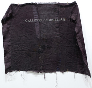 Milledge invokes elemental potency with pigments and geometry. She uses text to point ambivalently at ideas as well as images to represent them. Familiar themes are the realm of shamanistic ritual, environment and an invented pre-history. Textiles – often intensely-dyed hessian – appear in her paintings for their texture and connotative power, their standing in for nature. Glass has the potential to co-house a sharpening clarity with a darker, murkier content. Decidedly, nothing is clearly given.