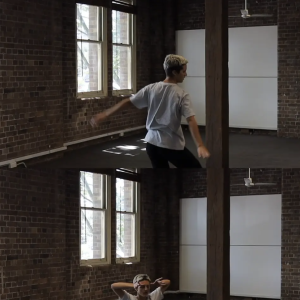 She is remembering using her fingers to measure her friend Geoffrey. They are dancing at Abbotsford Convent for Ellen and Alice. She is remembering seeing him in the distance and taking in the green walls of the long space with audiences sat along the edges. She is remembering doing this move in the context of this practice at Chunky Move with Ellen, Taree, Megan and Daniel. She is remembering the orange walls and pulling her fingers in that detailed way in relation to the seating bank which is stacked against the wall. As she moves her fingers in that way, she thinks about pasta and her friends in restaurants. She is mourning the difference each time as she focuses on the sensation in her upturned hand, in relation to the sensation held at the back of her head.