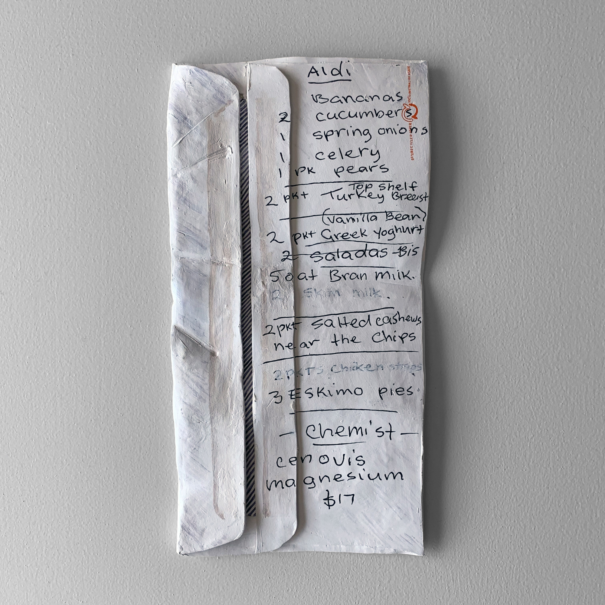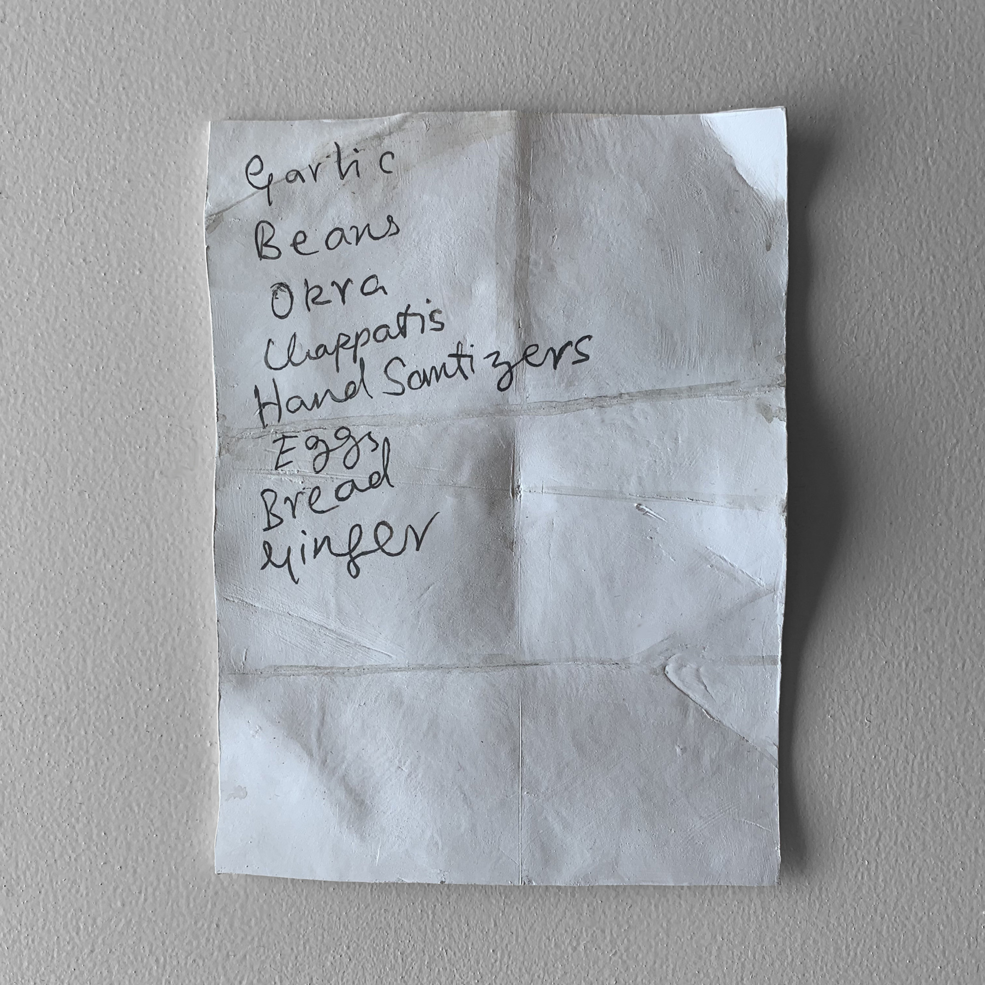 Here’s a ceramic sculpture of a shopping list I found last year written on both sides of an envelope.