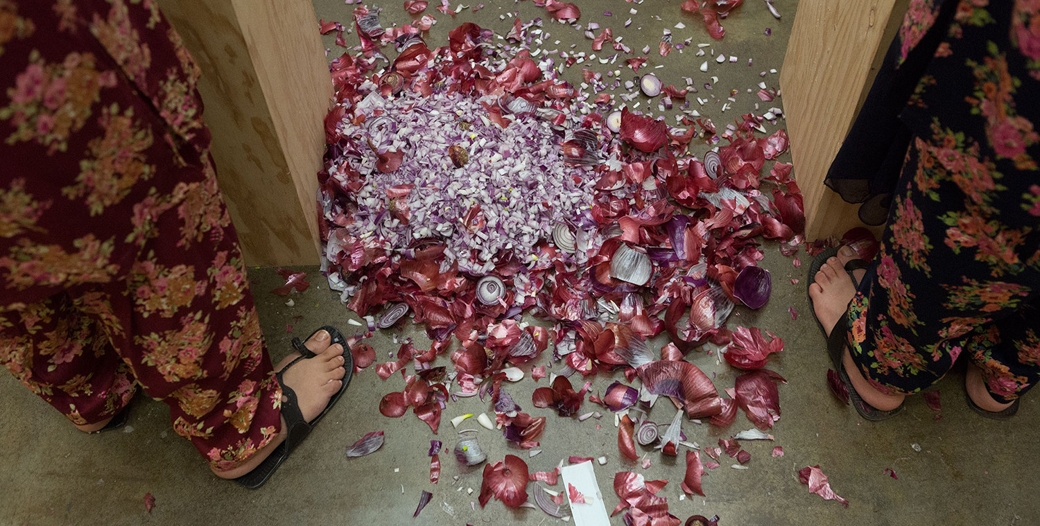 Dropping Tears Together is a live, durational performance in which the artists bring a domestic refrain to the gallery setting. Audiences are invited to hold the space with the artists as they chop onions and tell anecdotes about their lives in Pakistan.