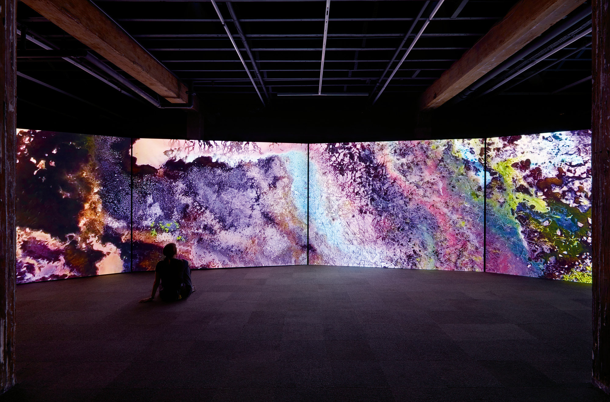 The exhibition includes a new iteration of Havini’s Habitat series, an immersive multi-channel video and sound installation. This is an ongoing investigation exploring the legacy of resource extraction and Australia’s fraught relationship in the Pacific.