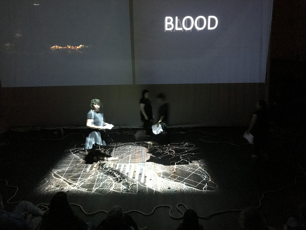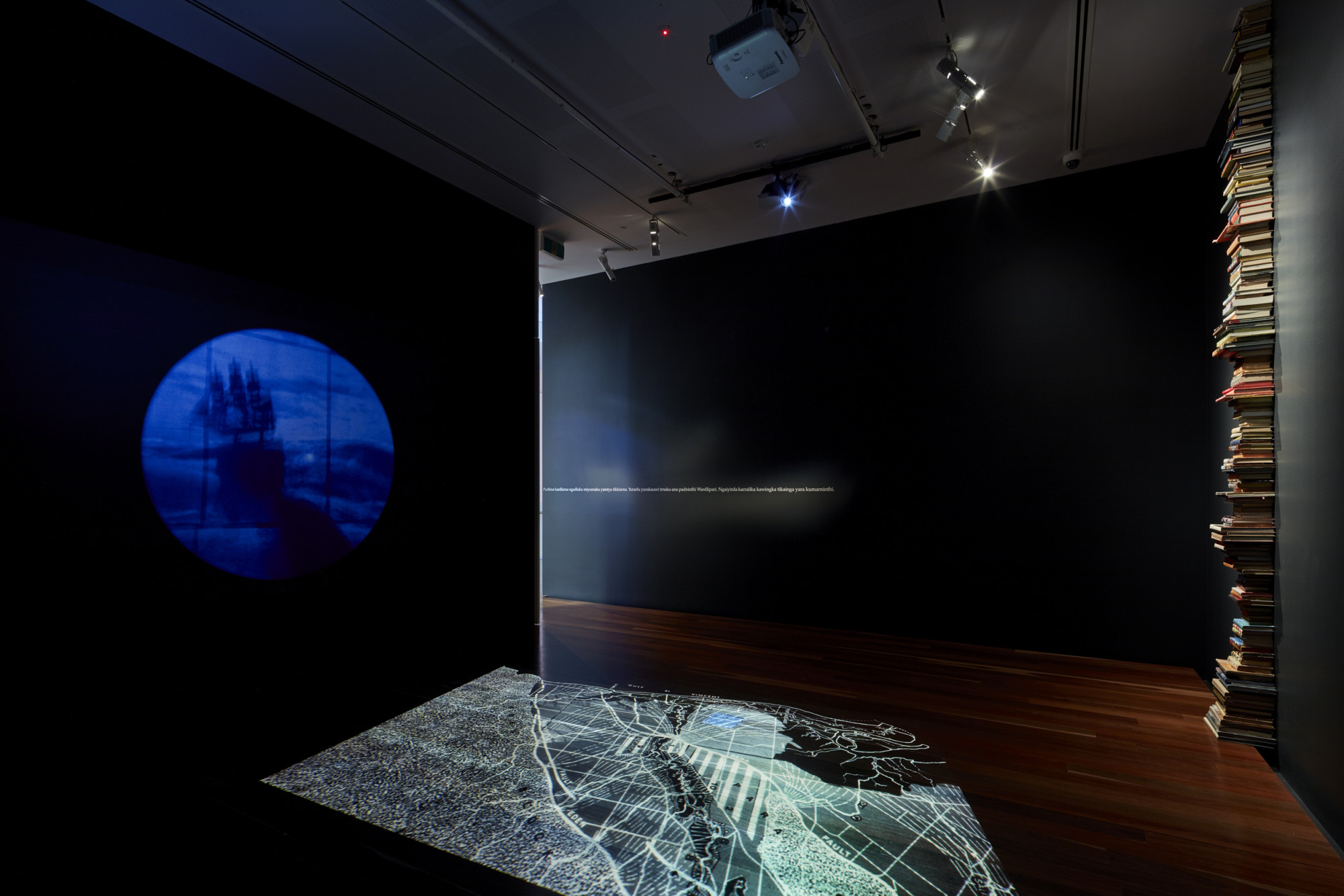 Inside the space, we stand upon a map of Adelaide – the network of rivers, streams and estuaries that lined the landscape before the city was built twists and weaves across the floor and across our bodies. The recorded voices of the Unbound Collective and Kaurna Elder and scholar Uncle Lewis Yarluburka O’Brien enact memory and storytelling, and speak back to sovereign identity and ways of understanding: “my skin speaks, my skin hears, my skin listens.” In Western tradition, the written word is relied upon to carry our history forward. The ongoing work of the Unbound Collective confronts that tradition through the visceral and emotive power of storytelling in all its forms, pushing for a more complete archive of human experience and consequence.