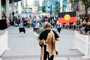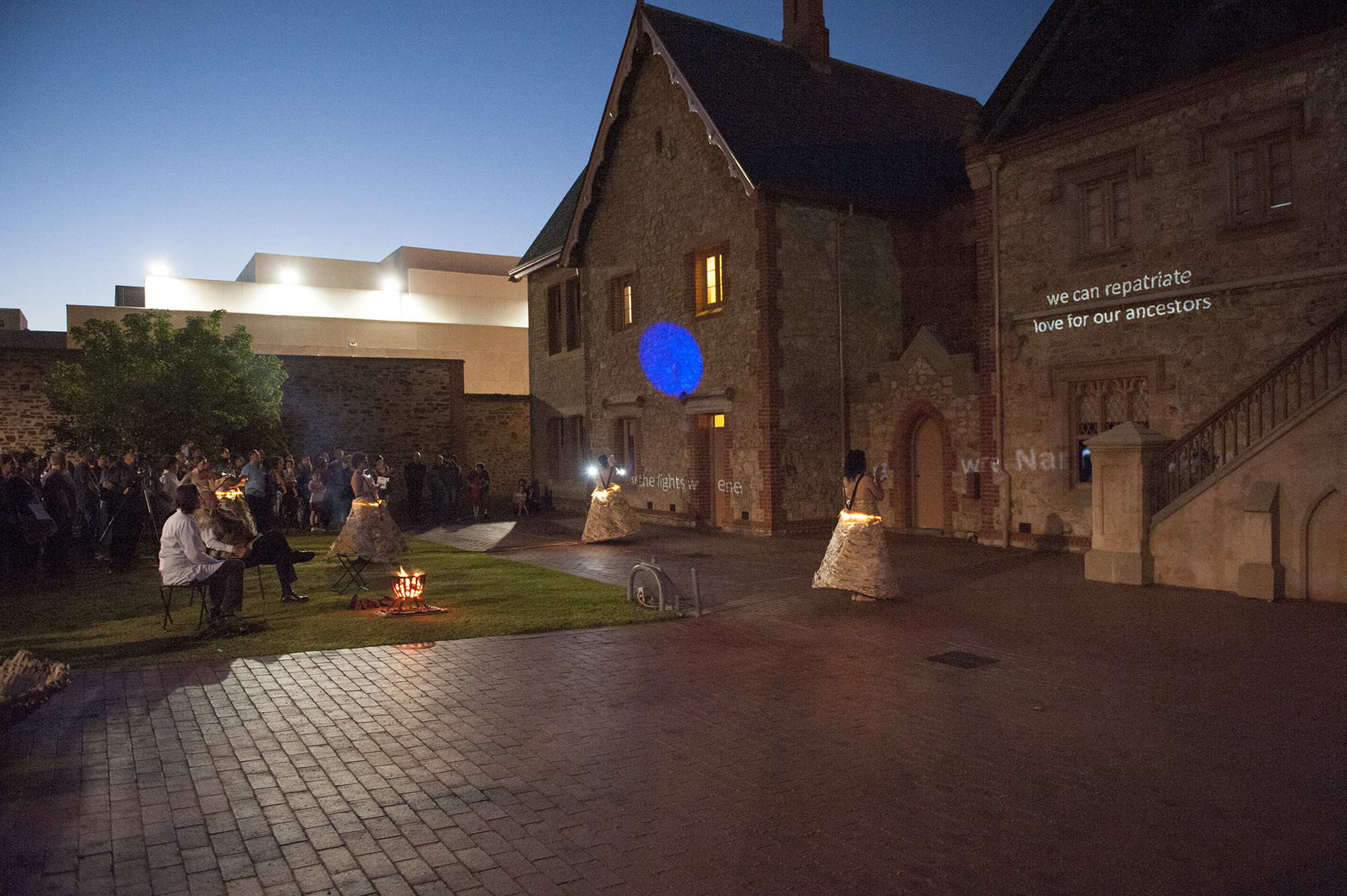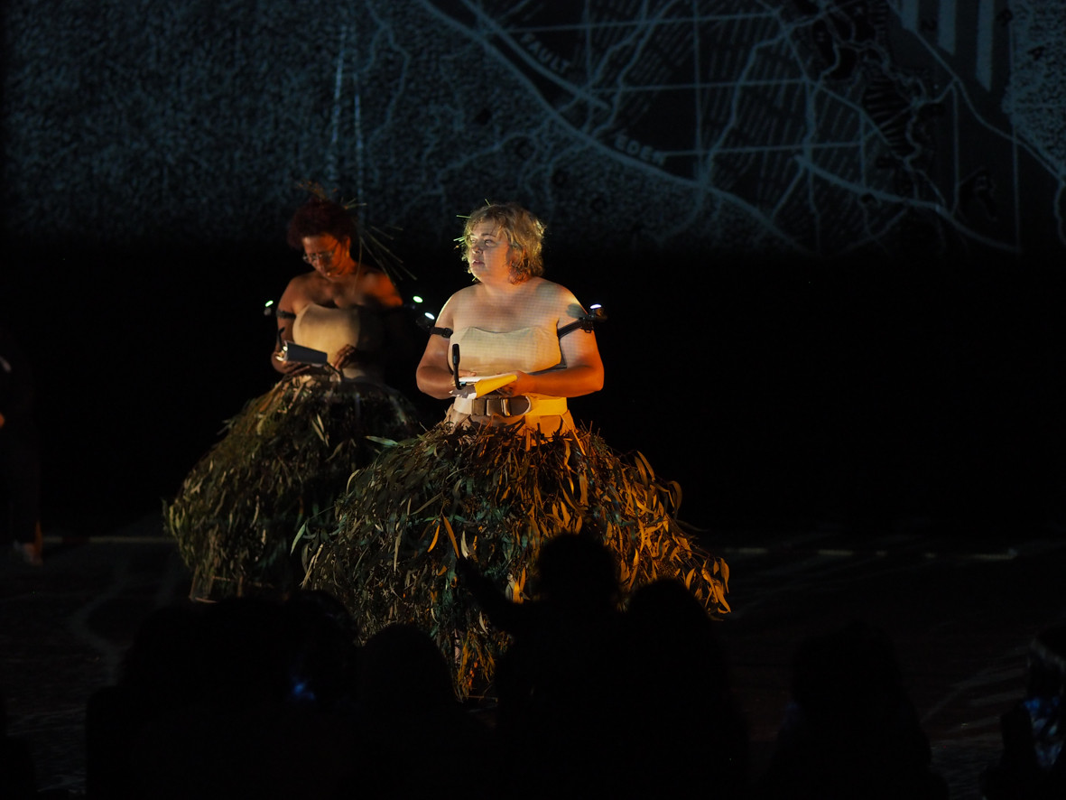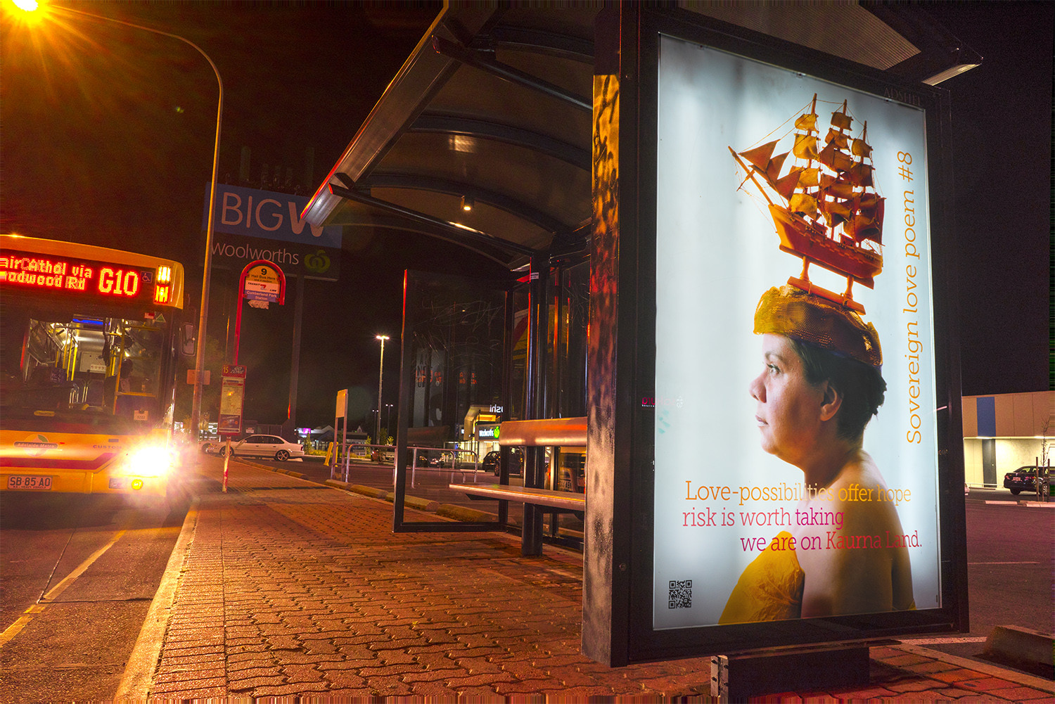 Act II was presented in three stages. Two site-specific performances were conducted in and around the city's colonial 'cultural-precinct'. Accompanying images and text were also installed to weave a QR-code narrative of sovereign love poems on ten bus shelters in the city and suburbs of Adelaide.