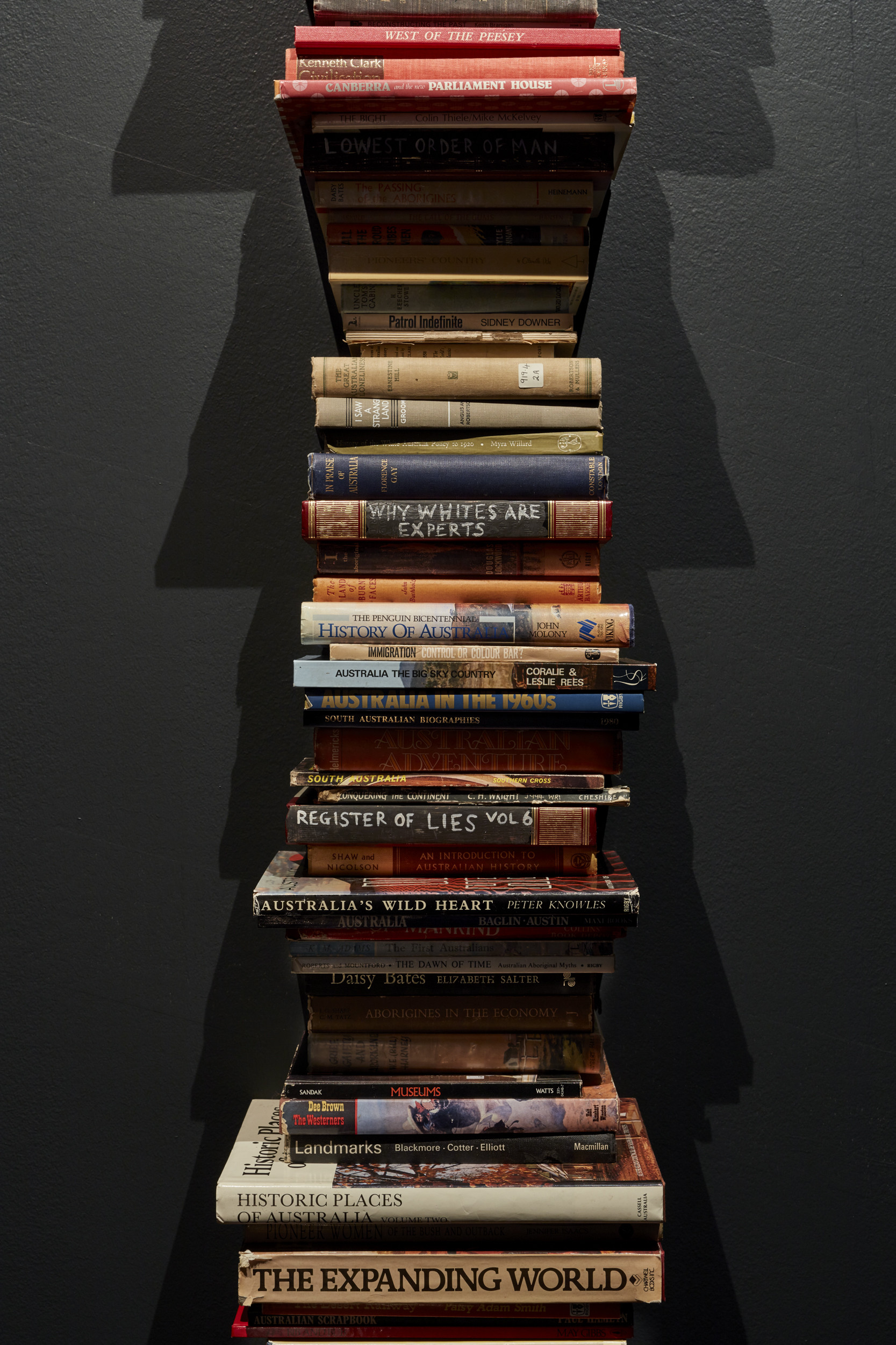 In Ali Gumillya Baker’s Racist texts, books are piled perilously high - four and a half metres - looming above our heads so that we must crane our necks to read their spines. We are unable to open these books and thumb through their pages but their titles face outwards, not to be ignored. Compiled over a period of five years, Baker’s installation of texts stand as an ‘anti-memorial’, a marker of what has entered the narrative and what remains absent.