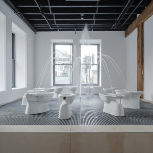 EJ Son’s Fountain imagines a metaphorical solution for the ‘constipated heart’—a term the artist uses to describe a clenched (typically cis-male) soul incapable of emotional expression. In this presentation for Artspace, eleven bidets face each other in a circular assembly, each releasing a pressurised jet of fluid.