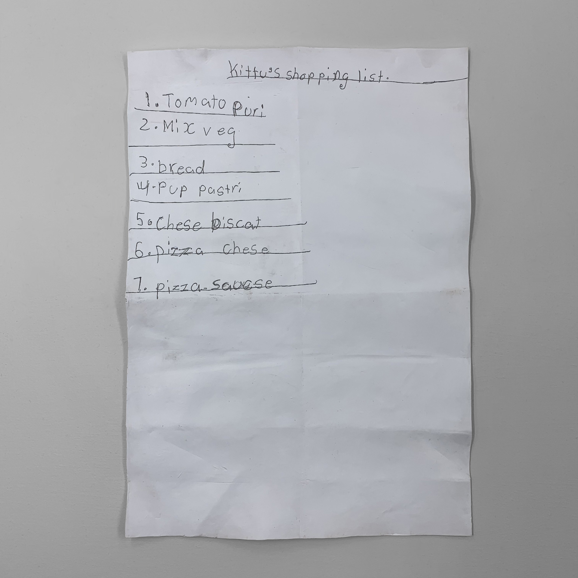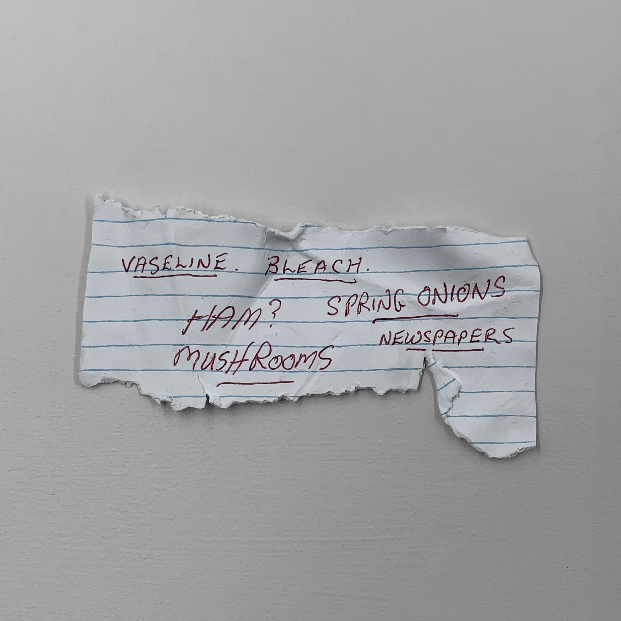 With schools closed last year, there was an increase in shopping lists written by children. Here’s a ceramic sculpture of a shopping list I found written on the back of some maths homeschooling.