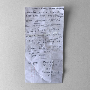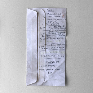 +I was 15 when I first got a part time job as a supermarket trolley pusher and I’ve now worked there on and off for more than half my life. Part of the job is getting rid of any rubbish left behind in the trolleys, which is usually just receipts, catalogues or more interestingly, abandoned shopping lists. Supermarkets are a funny intersection between the public and the private, and shopping lists can often provide a unique portrait of the people we pass in the aisles.