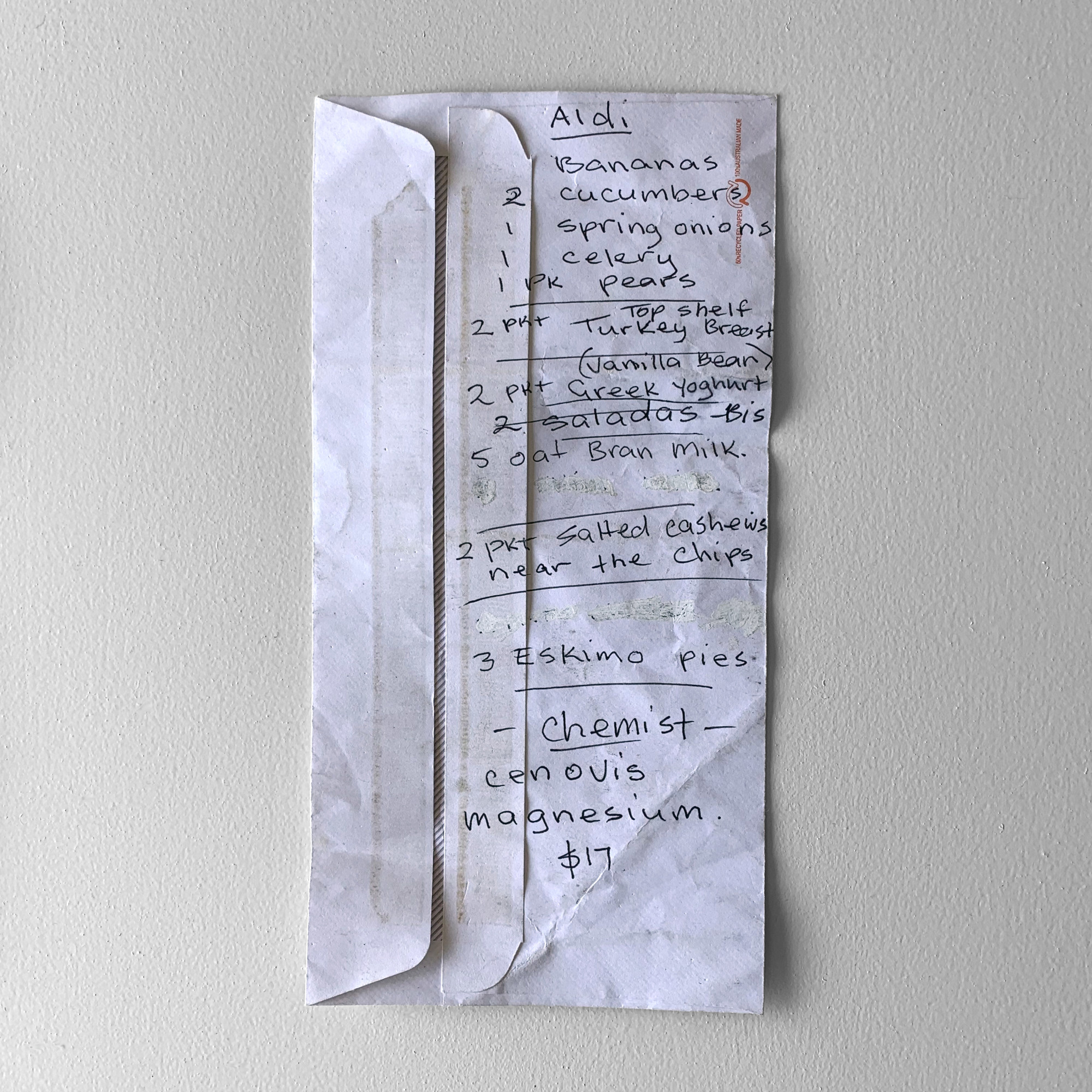 Here’s a ceramic sculpture of a shopping list I found last year written on both sides of an envelope.
