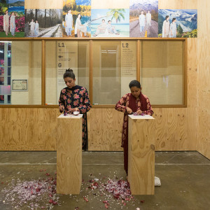 Dropping Tears Together is a live, durational performance in which the artists bring a domestic refrain to the gallery setting. Audiences are invited to hold the space with the artists as they chop onions and tell anecdotes about their lives in Pakistan.