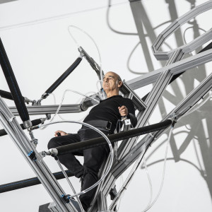 A nine-metre long, four-metre high, nine-degree-of-freedom reclining stick robot was engineered, animated by antagonistically bundled pneumatic rubber muscles. If no-one intervenes a background algorithm intermittently actuates the robot. The robot is continuously rotating on its axis, its changing shadow projected onto three walls. The pneumatic rubber muscles contract and extend, generating a sense of anthropomorphic aliveness. Visitors to the gallery space can send commands to the robot via a panel of switches, whilst people in other places can move the robot remotely online. In a five-hour performance, attached to the torso of the robot, the artist could insert his own movements using pneumatic joysticks. Counterpointing, synchronising and improvising to local and remote actuations of the robot. The droning of the motor sounds, the solenoid clicking sounds and the compressed air not only register the movements of the robot but also amplify its physical presence. The robot installation is operational and accessible until 16 August 2020 during AGSA gallery hours 10:00am-5:00pm @ recliningstickman.stelarc.org
