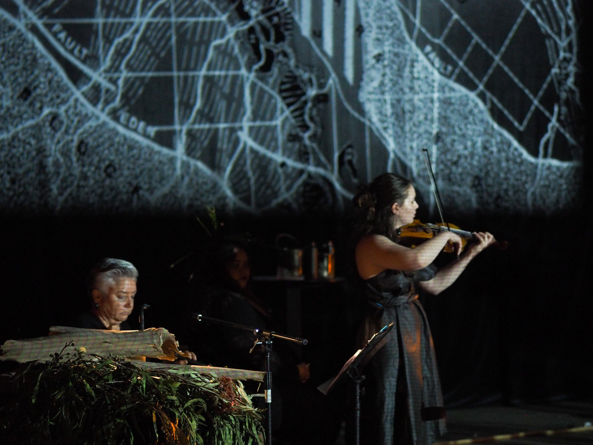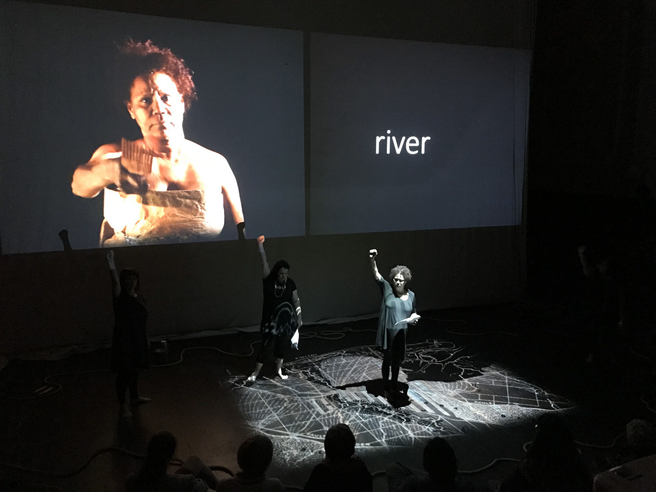 Inside the space, we stand upon a map of Adelaide – the network of rivers, streams and estuaries that lined the landscape before the city was built twists and weaves across the floor and across our bodies. The recorded voices of the Unbound Collective and Kaurna Elder and scholar Uncle Lewis Yarluburka O’Brien enact memory and storytelling, and speak back to sovereign identity and ways of understanding: “my skin speaks, my skin hears, my skin listens.” In Western tradition, the written word is relied upon to carry our history forward. The ongoing work of the Unbound Collective confronts that tradition through the visceral and emotive power of storytelling in all its forms, pushing for a more complete archive of human experience and consequence.