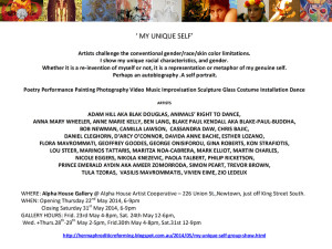 Being exhibited at VOLUME 2015 is a catalogue for the self-portrait group show "My Unique self" curated by Flora Mavrommati. The art book is edited by Flora Mavrommati and includes all artists' statements, images of the works, paintings, photographs, glass, collages, poetry, songs, videos, and live performances. In the exhibition participated thirty-five artists from Australia, Europe, and America.